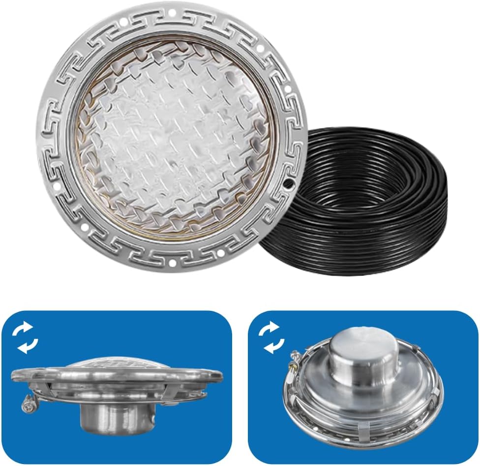 - 100 FOOT CORD - The long 100-foot cord ensures easy installation and flexibility, making it a great choice for those needing a 100 ft cord or cable for pool light. This feature is essential for pool LED lights underwater and LED underwater pool lights setups, ensuring that your pool light installation is hassle-free.
