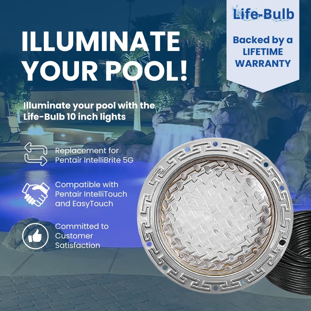 Life-Bulb 10" Intelli Pool Light for Inground Pool - 120V - 100 Ft Cord - Swimming Pool Light Fixture, Pool LED Lights - Replacement for Pentair IntelliBrite 5G - Lifetime Replacement Program