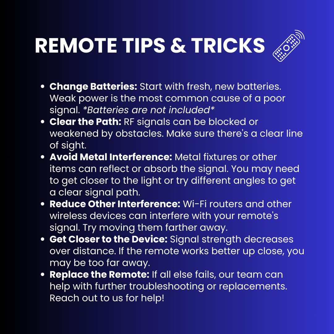 Important: Remote controls for LED pool lights use a radio frequency (RF) signal to communicate with the receiver inside the light. RF signals are easily interfered by signals in the air such as wi-fi and cell phones. RF signals can transmit through water. However, the signal can still be blocked if the light is inside a metal light fixture.